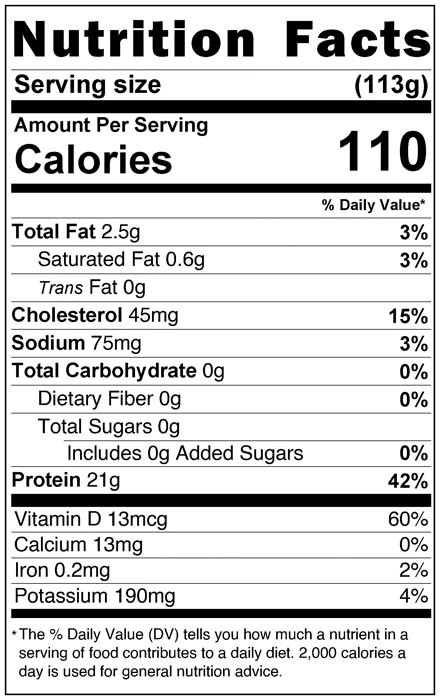 | Thawing Instructions | Remove from bag and thaw under refrigeration for 4-6 hours or place under running water until thawed. DO NOT leave<br /> soaking in water, it will affect the flavor and texture of the fish. |